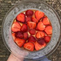Frangipanebodem met huisgemaakte kookroom en verse aardbeien. 6-8 personen