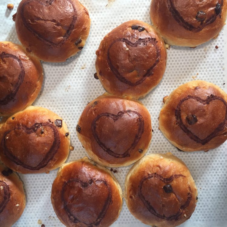 Bloem, melk, roomboter, ei, suiker, chocolade stukjes, water, gist, suiker, zout