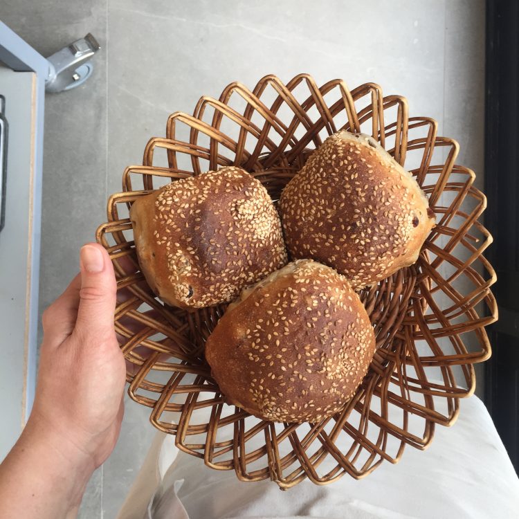 Tarwebloem, desem, rozijnen, zonnebloemolie, zout, gist, water en sesam decoratie